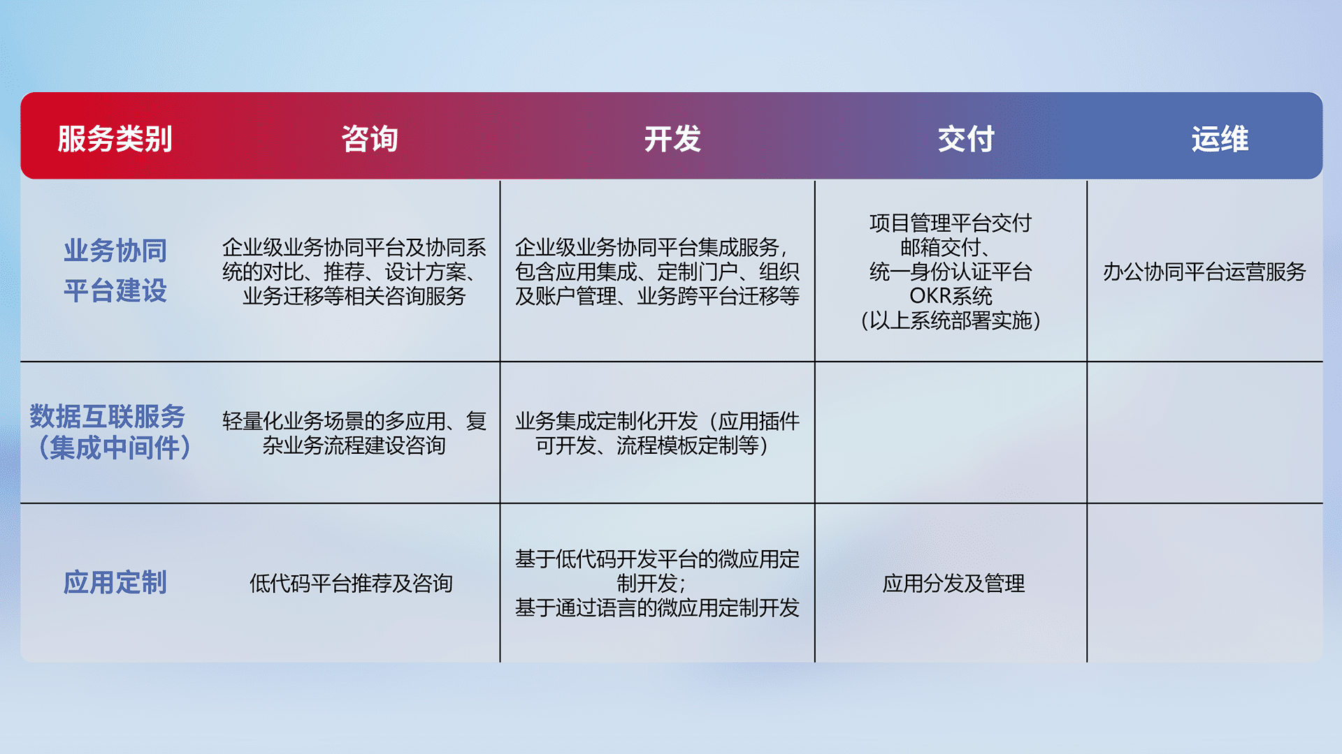 针对钉钉、、、、企微、、IDaas等平台级产品提供产品的规划、、方案、、、、交付、、、、定制化开发等服务,,,,实现如统一协同办公、、智能客户服务、、、混合会议管理、、、、智能数据查询、、等业务场景,,,,实现数字化转型。。。