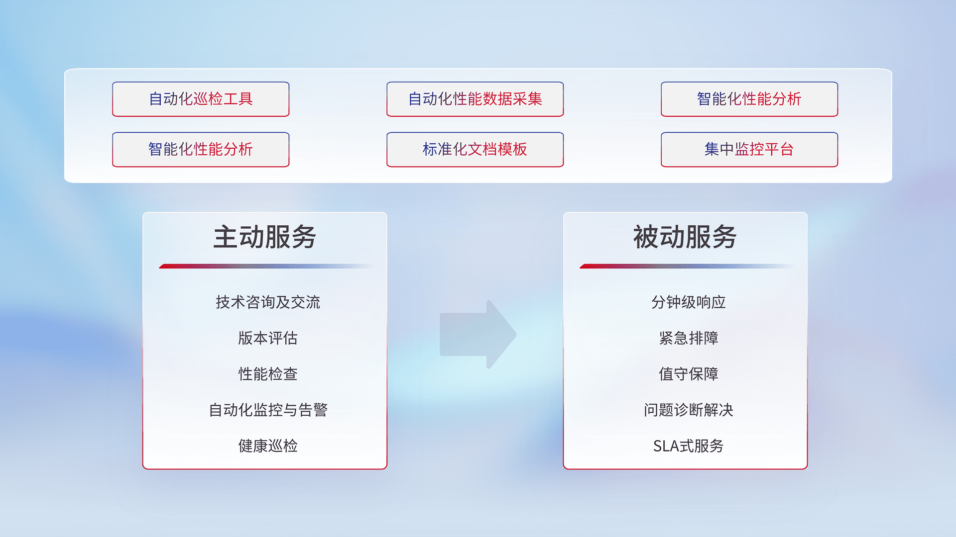 智能化工具和标准化文档,,保障服务质量,,,提供主动服务(包含技术咨询、、、、版本评估、、性能检查、、、、自动化监控与告警、、健康巡检)和被动服务包含(分钟级响应、、、紧急排障、、值守保障、、、、问题诊断解决、、、、SLA服务)。。